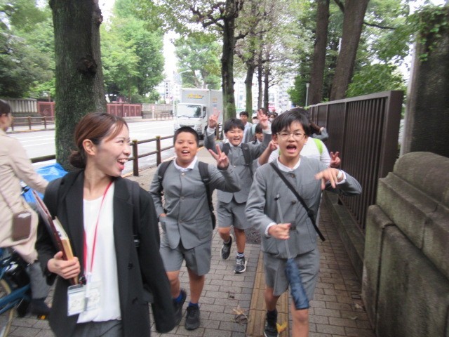 2日目の活動スタートです。最初は、国立科学博物館の大きなシロナガスクジラの像の前で、クラスごと写真を撮りました。そのあと班ごとの活動に入りました。