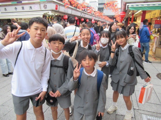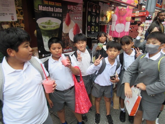 浅草見学での楽しみの一つ、「食べ歩き」。とてもおいしそうなものを見つけて食べている班に多く出会うことができました。