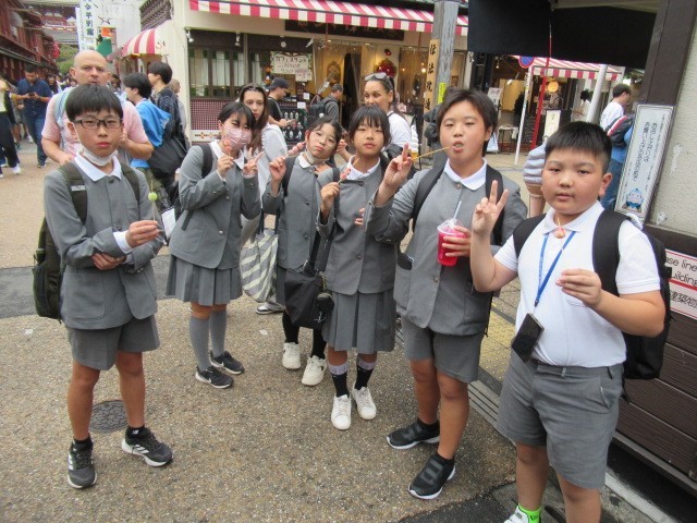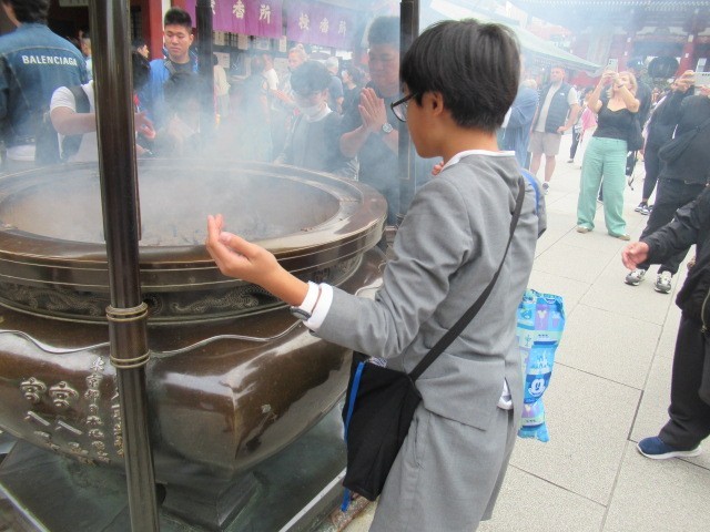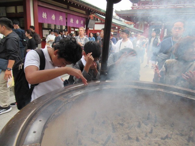 有名な浅草寺のお香の煙を浴びるところです。かなりの煙の量に苦戦している子供たちでした。