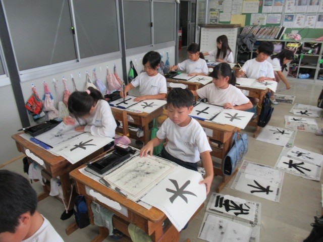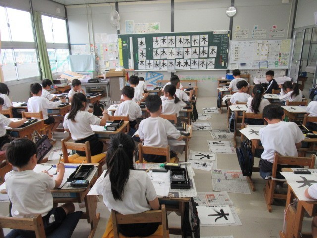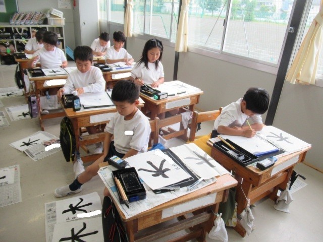 3年生の書写の授業の様子です。この時期は、「席書コンクール」があり、どの学年も取り組んでいます。3年生は、「木」という字に挑戦です。一文字なので簡単なように思えますが、止めやはらいなど、習字の基本がいっぱい詰まった字です。3年生になって習字を始めた子も多いので、大変かもしれませんが、どの子も集中して良い字を書こうと取り組んでいました。