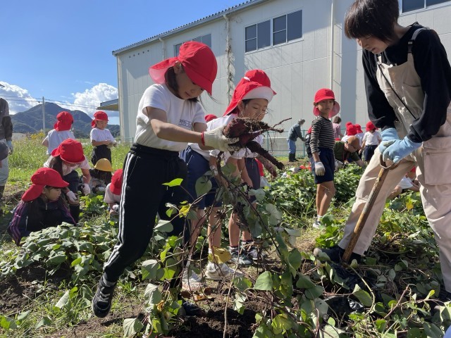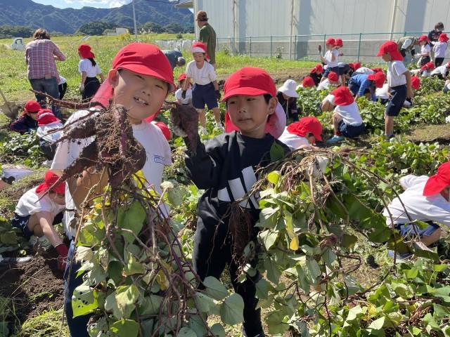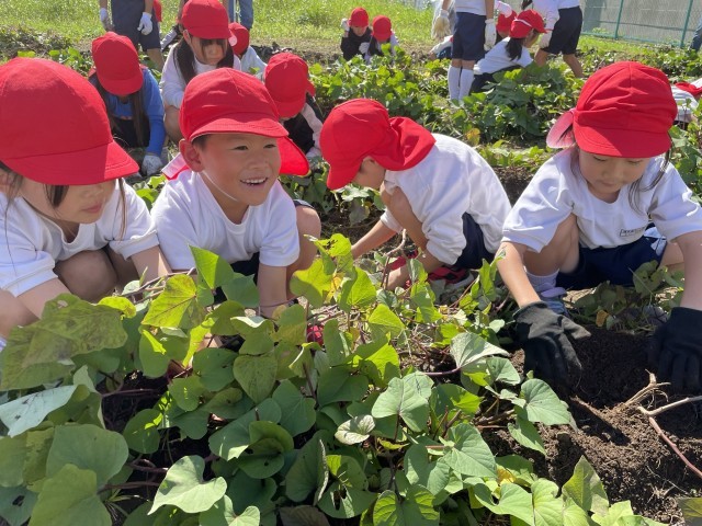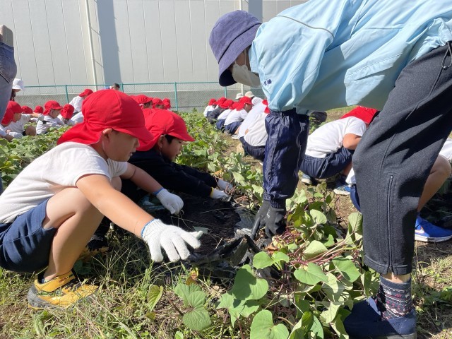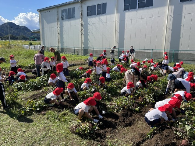 1年生が6月に植えたさつまいもが、収穫を迎えました。ここまで畑のお世話をしてくださった地域の方にお手伝いいただきながらいもほりをしました。今年は夏の暑さで生育が心配されましたが、皆一生懸命土を掘り、丁寧に傷つけないようおいもを掘ることができました。収穫したおいもは、1年生が家に持って帰るほか、給食でも提供されます。一生懸命掘ったおいもはきっとおいしいですね。