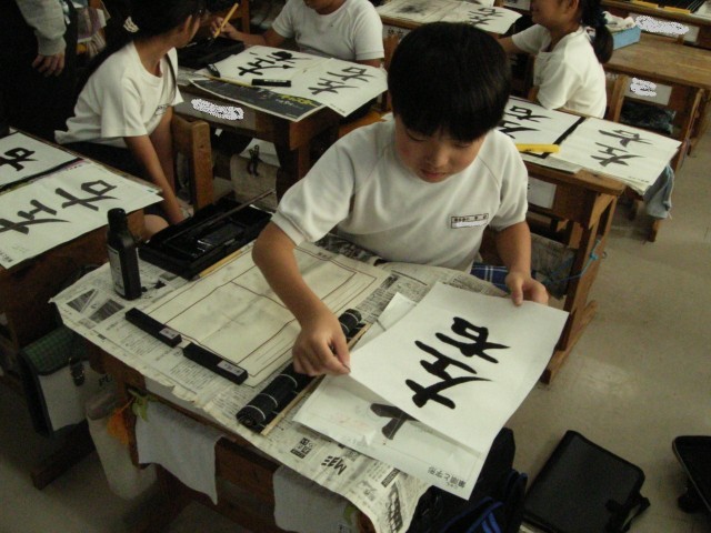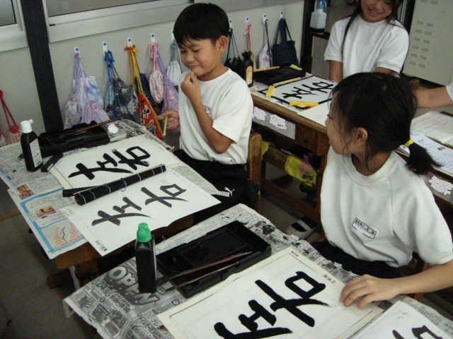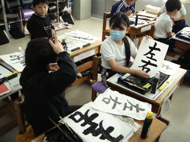 書写の授業です。「左右」という漢字の筆順やバランスに気をつけながら筆を進めます。友達と出来栄えを見合ったり、お手本に重ねたりしながら、次に書くときにはどこに気をつけたらいいか、よく考えていました。