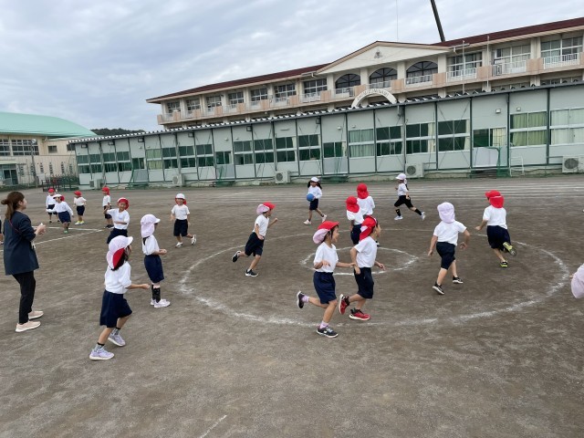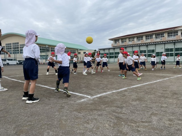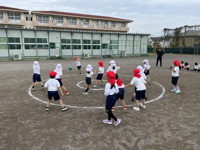 体育の授業です。小学生の休み時間の遊びと言えばドッジボールです。1年生は、コートの端から端までボールを投げるのがなかなか難しく、「円形ドッジ」から練習します。ルールを覚えながらやりますが、急にボールが手元に来ると、まだまだどうしていいか迷ってしまいます。徐々に覚えて、自分たちでルールを守りながら遊べるといいですね。