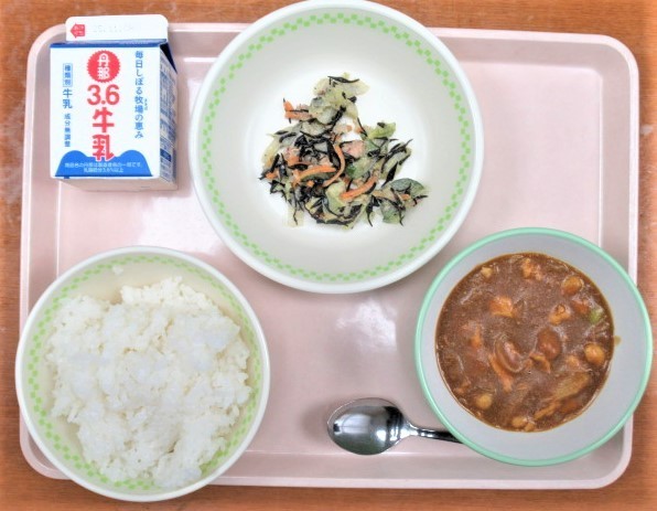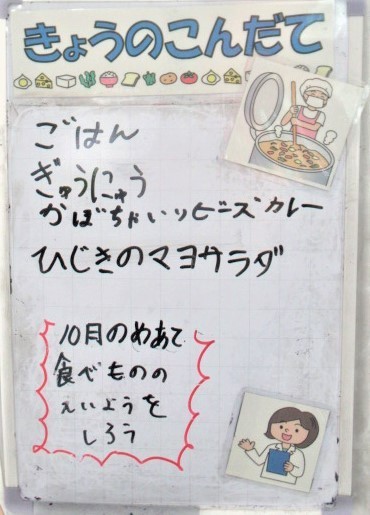 「ハロウィン」には欠かせないかぼちゃが、今日の給食では、カレーの中に入っていました。カレーの中に油で揚げたかぼちゃを入れてくれました。揚げることによって水分が抜けてかぼちゃの甘味がよく分かるようになるそうです。甘味と辛味と塩味のバランスがちょうどよくて、とてもおいしかったです。