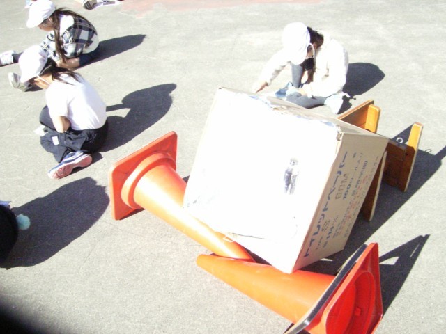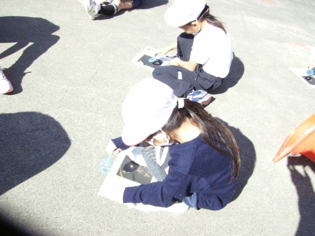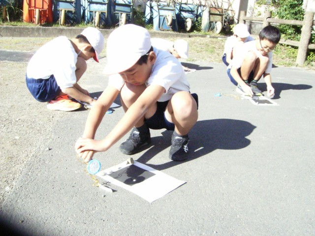 理科の授業です。レンズを使って太陽の光を集め、熱が発生する様子を実験しています。理科の実験は、時に危険を伴うこともあります。少し風が吹いていましたが、子供たちは紙を抑えながら安全に気を配って集中して実験をしていました。また、合わせて「ソーラークッカー」で熱を集めてお湯を沸かす実験も行いました。中央のボトルに水を入れて、太陽の熱で温めます。実験前は15℃だった中身は1時間経ち29℃まで温度が上昇しました。様々な角度で、太陽の力を実感した1時間でした。