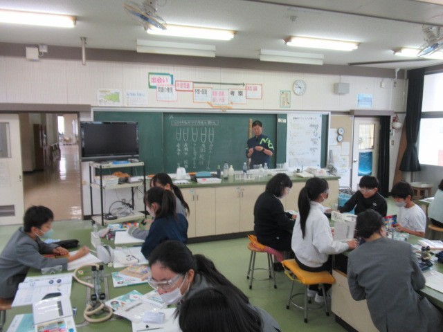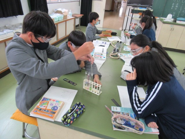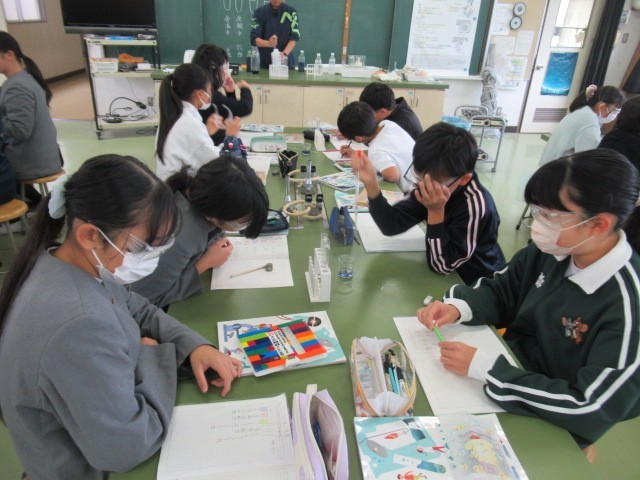 6年生の理科の授業の様子です。水溶液の性質についての学習で、ムラサキキャベツの水溶液と炭酸やアンモニア水、塩酸等の水溶液を混ぜるとそのような変化が起きるかを実験していました。ムラサキキャベツの水溶液を混ぜると、水溶液が水色になったり、黄色くなったり、緑色になったりするので、子供たちも楽しく興味を持ちながら実験に取り組んでいました。実験で色の変化を見るのは楽しいですが、肝心なのは、この実験からどんなことが分かるかを考察することです。どんな考察にたどり着いたのでしょうか?