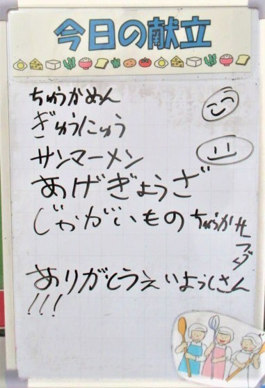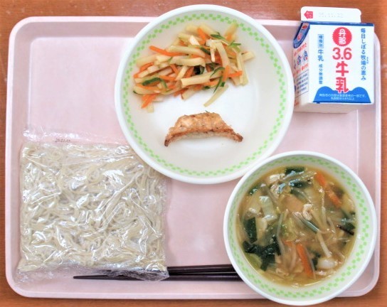 給食は、「サンマーメン」が出ました。サンマーメンは、もやし、にんじん、キャベツ、にらなどの野菜炒めに、トロッとしたあん(片栗粉でとろみをつけたスープ)をかけたラーメンです。「生馬(サンマー)」は、中国語の「生(サン)=新鮮」「馬(マー)=あたたかい」という意味から来ていて、「新鮮な野菜を使った、あたたかい麺」という意味なんだそうです。「サンマ」が入った「サンマ味」のラーメンではありませんね。