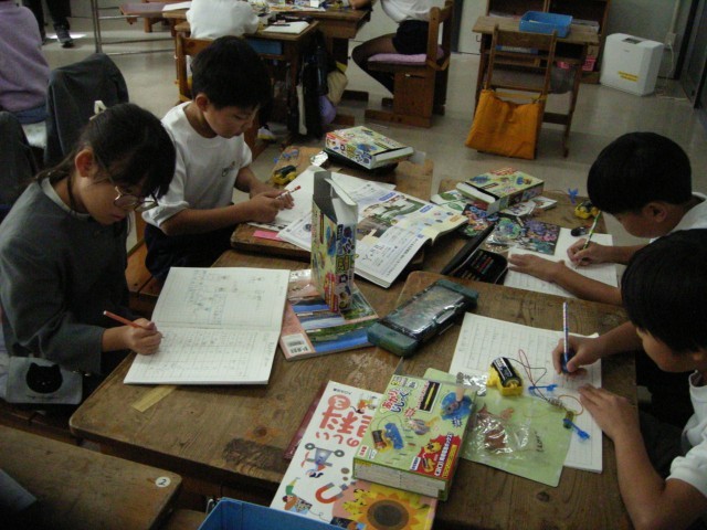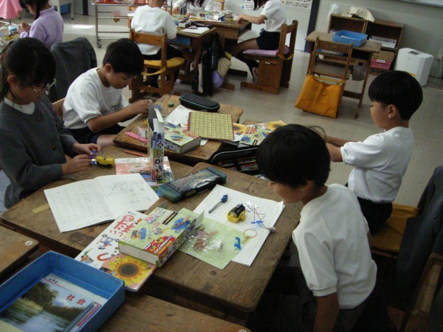 理科の授業です。電気を通すものと通さないものについて、予想を立て、実際に試してみました。電池と豆電球の回路の一部を切り、その端を。電気を通すと思うものにあてます。下敷きは電気を通しません(頭にこすると静電気が起きるのになぜでしょう?)。アルミ缶も、そのままだと通しませんが、塗装を削ると通しました。この実験の結果からわかることは何でしょう。子供たちは一生懸命考えていました。