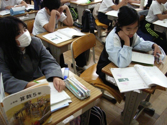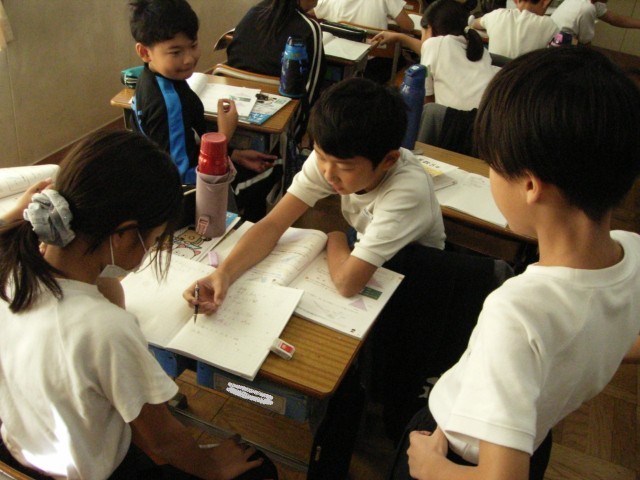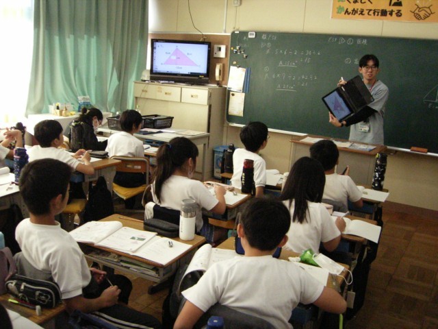 算数の授業です。三角形の面積は「底辺×高さ÷2」です。この公式を活用して、面積を求めるのではなく、高さを求めるにはどうしたらいいだろう、と考えています。ICTは、図形を回転したり、画面上で切り取ったりと便利に活用できますが、あくまで頭の中で考えたことが出発点です。自分の頭の中のアイディアを友達の意見と比べながら、ああでもない、こうでもないと、図形から読みとれる情報を駆使して答えを探していました。