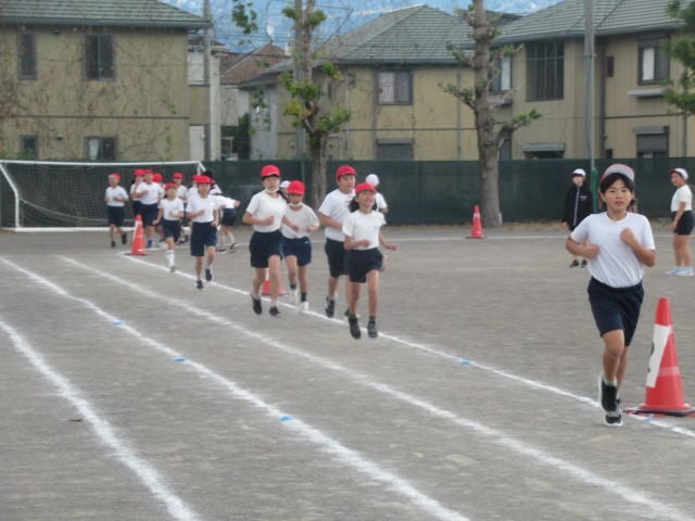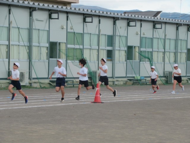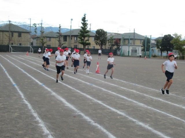 5年生の体育の授業の様子です。5年生も「持久走」に取り組んでいます。4時間目に行っていましたが、空が曇り空となり、肌寒い様子でしたが、走る前にしっかりと体を温めてからスタートしていました。走っている姿から、自分の目指す距離をしっかり決めて取り組んでいる様子がうかがえました。