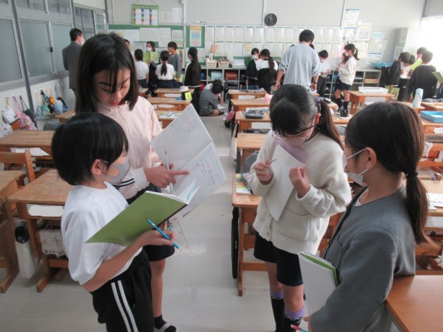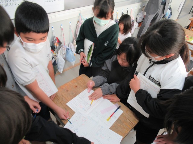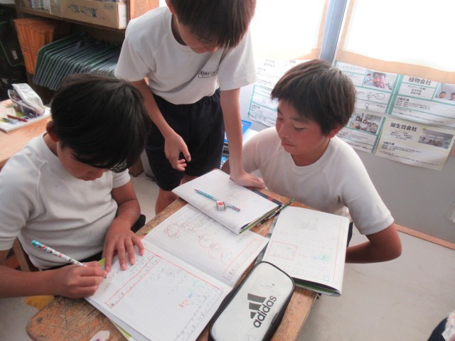4年生の算数の授業の様子です。小数のわり算について学習しています。「4.5÷3」の計算の仕方を見つけています。今まで、わり算のきまりを使って計算したり、小数の数字を2つに分けて考えたり、筆算で求めたりして来ているので、その知識をうまく応用してできないかを話し合いながら解決しています。自分の考えをもって、グループ内でちゃんと説明できているところに感心しました。