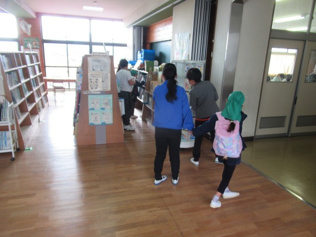 1年生の教室に案内する一方で、学校内を案内する5年生にも会いました。全員が一度に1年生の教室に行ってしまうと大混雑になるので、半分ずつに分かれての案内です。南校舎の5年生や6年生の教室をのぞいたり、図書室をのぞいたりしていました。