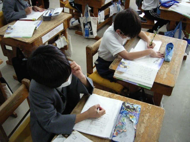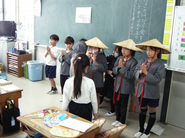国語の授業です。かさこじぞうを読んだ子供たちが、劇をします。演じる子供たちも一生懸命ですが、それをじっと見つめる子供たちのまなざしもとても素敵でした。物語では、おじいさんが傘をかぶせる時間はすっと過ぎますが、実際にやってみるととても時間がかかります。きっと寒かったのに「これでええ。」と言ったおじいさんの心の中には、いいことをしたな、よかったなという気持ちで寒さを感じなかったのかもしれない、という意見。おばあさんの「ほほとわらって」という叙述に注目して、幸せな気持ちになったと思うという意見。子供たちは、劇を通しておじいさんやおばあさんなど、登場人物の気持ちをじっくりと考えていました。
