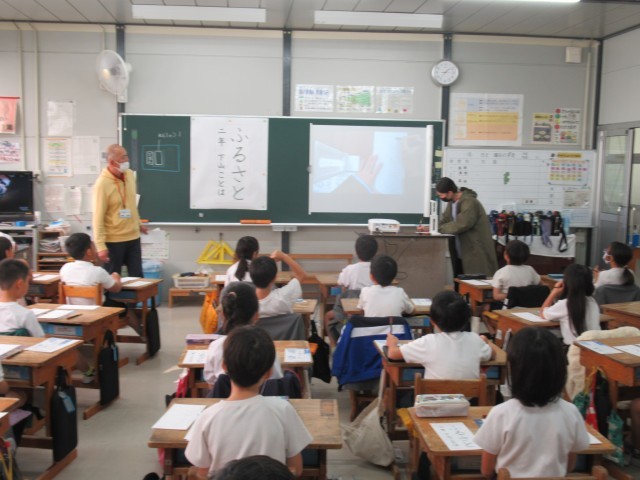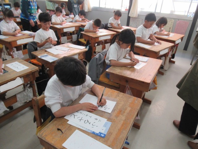 2年生の書写の授業の様子です。2年生もボランティアの方々にお手伝いいただいて、フェルトペンでの書き初めの練習をしました。文字の書き方を教えていただいたり、子供たちが書いている様子を見守っていただいたりしました。いつもとはちょっと違う雰囲気なので、子供たちも緊張している様子でしたが、一生懸命頑張りました。