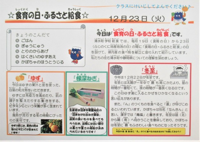 今日の給食は、「食育の日・ふるさと給食」でした。昨日が「冬至」でしたが、給食では、今日冬至に関するメニューを提供してくれました。