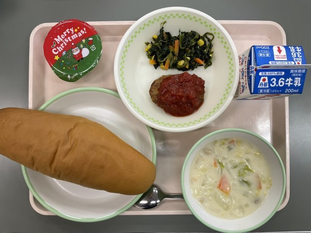 今日は朝から雨が降り、寒さの厳しいクリスマスイブとなりました。今日の給食は赤、緑、白のクリスマスらしい彩りのメニューで、心も体も温まりました。いよいよ明日から冬休みが始まります。休みの間も、体調管理に十分気をつけて、年明けにはまた元気に会えることを楽しみにしています。