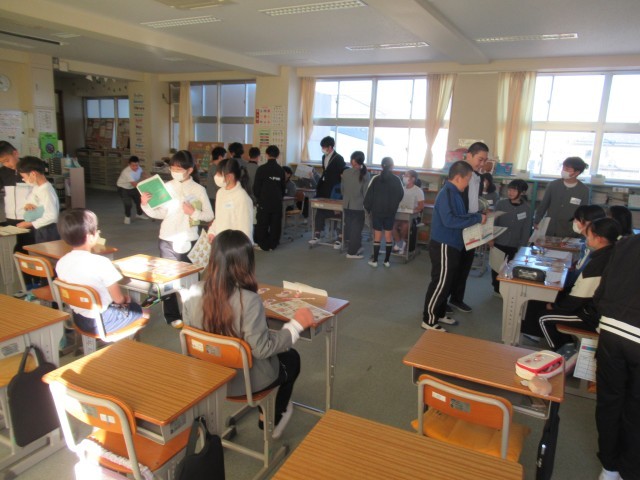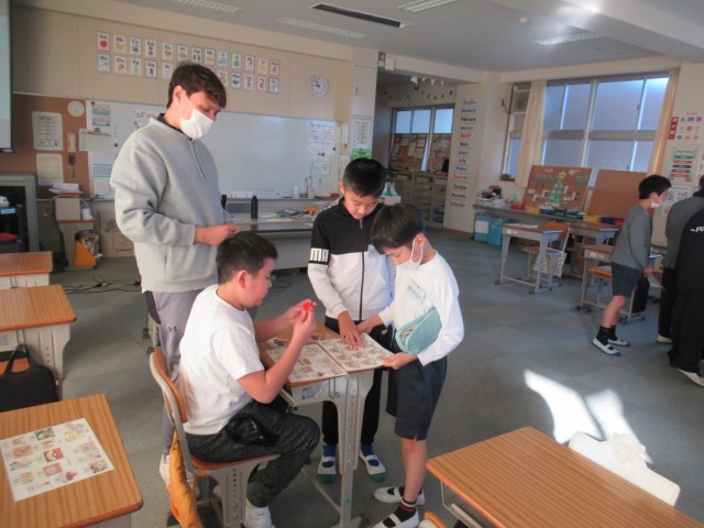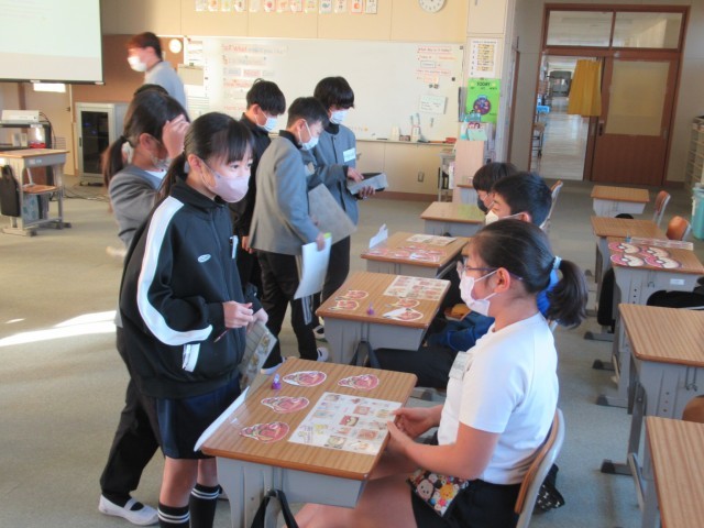 5年生の外国語の授業の様子です。「Food(フード)」「Dssert(デザート)」「Drink(ドリンク)」を販売するお店役の子供たちと、買い物をするお客さん役の子供たちに分かれて、英語で会話をしながら買い物を楽しむ学習でした。難しいのは、値段を英語で表現することのようでした。「1500円」を英語で言うと「One thousand Five hundred(ワンサウザンド ファイブハンドレッド)エン」と発音するという練習もしながら進めていました。英語でコミュニケーションをとりながら、笑顔で楽しそうに取り組んでいました。