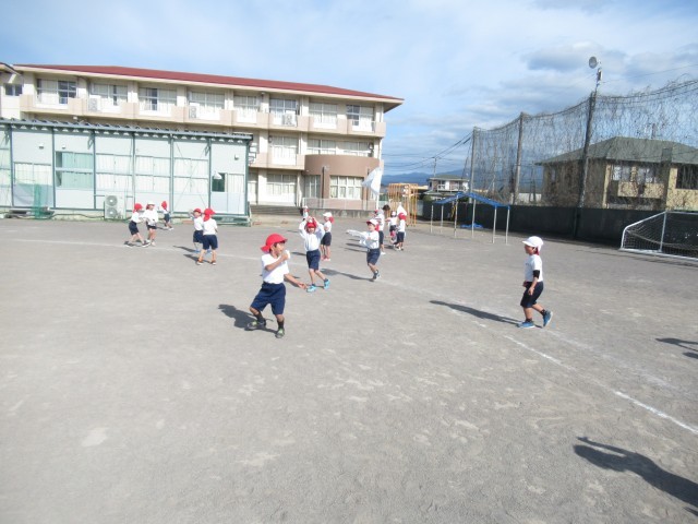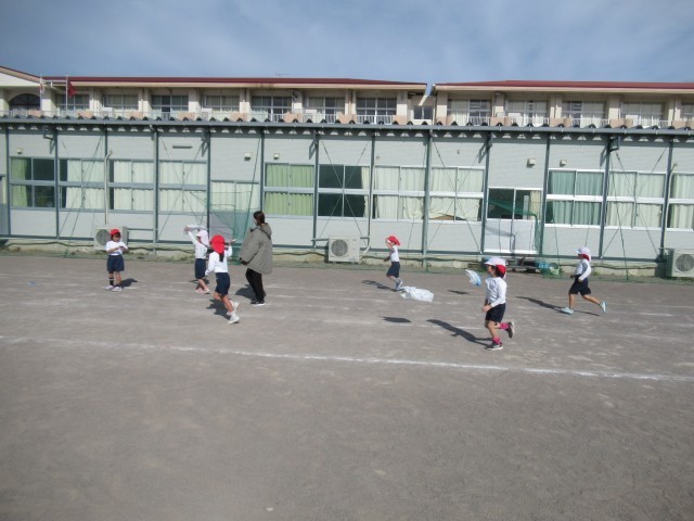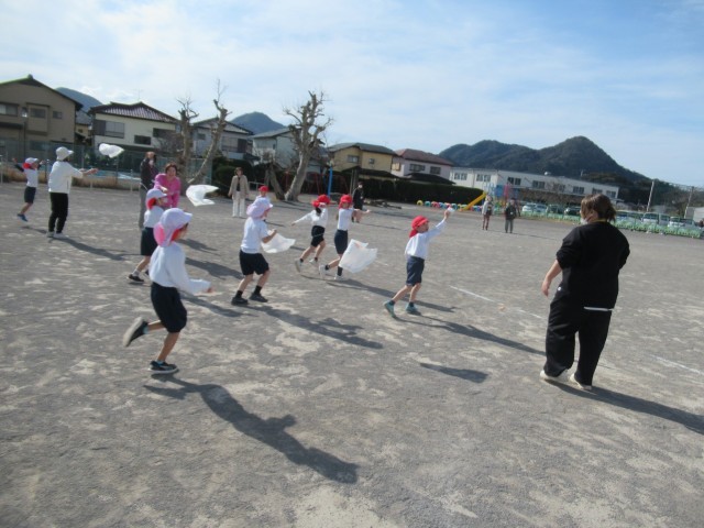 1年生が生活科の授業で、お正月の遊びに挑戦しています。今日は、凧揚げ。自分でデザインして作った凧を、運動場で揚げていました。最近ではなかなか凧を思いっ切り揚げられる場所がないので、凧揚げを初めて経験する子供も多いようでした。