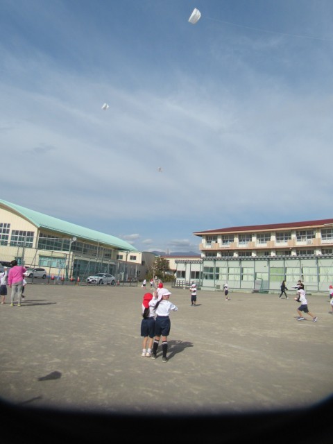 糸の伸ばし方や風の向きに合わせて揚げると良いことが段々分かってきた子供たちは、上手に風を受けて高々と凧を揚げている子も見られました。みんなとても楽しそうでした。