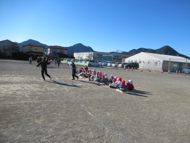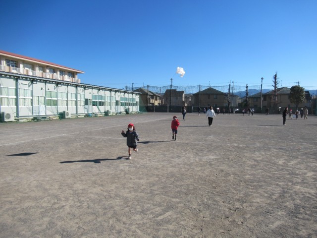 1年生の凧揚げの様子です。今日はとても気持ちのよいきれいな青空でしたが、残念ながらほぼ無風で、1年生の子供たちの凧は、一生懸命走り続けないと揚がらない状況でした。それでも子供たちは凧揚げを楽しんでいました。