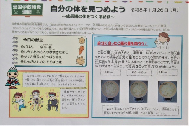 全国学校給食週間の2日目です。「自分の身体を見つめよう」がテーマなので、今日は、「自分に合ったご飯の量を知ろう!」と題して、栄養教諭が教室掲示用のおたよりを作成しています。写真の3枚目がそれにあたります。自分の食べられる量と必要な量などを考えて、食事をとれるようになるといいですね。