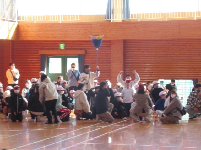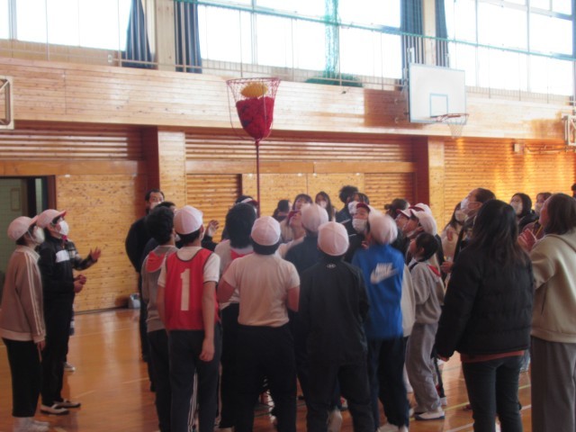 親子ミニ運動会の玉入れ競技の様子です。いくつ入ったかを競うのではなく、どこが一番早く全部かごに玉を入れられたかで勝負を決めていました。こちらも盛り上がっていました。