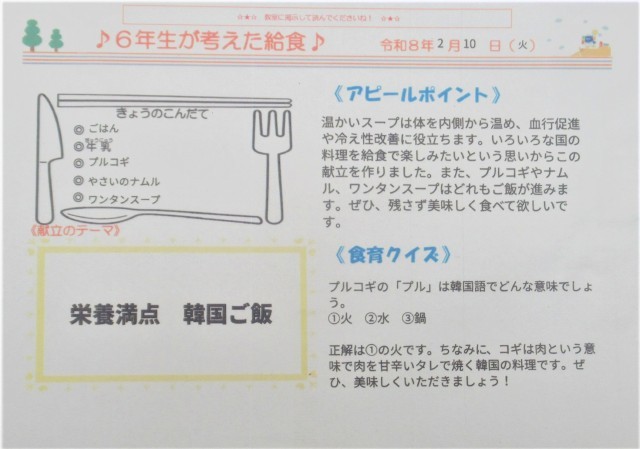今日の給食のメニューは、6年3組が家庭科の授業で考えた「栄養満点 韓国ご飯」をテーマにしたメニューでした。プルコギやナムルが食欲を増し、ご飯が進みました。また、ワンタンスープで体の中から温まりました。