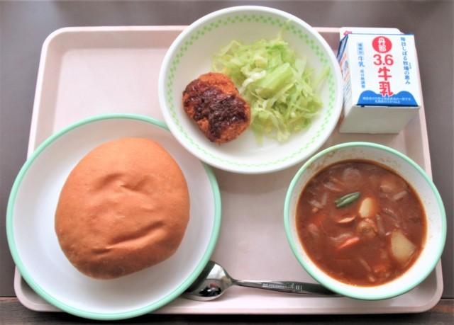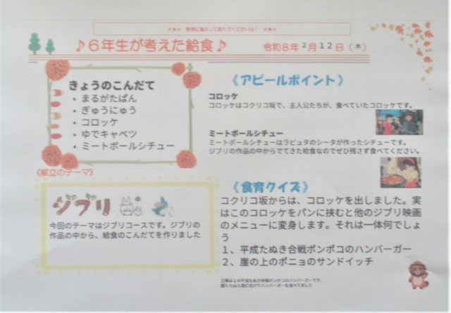 今日の「6年生が考えた給食」は、6年4組の考えたメニューです。「ジブリの作品の中から、献立を作りました」ということです。大きな丸形パンを自分で開いて、コロッケと茹でキャベツをはさんで食べました。とっても食べ応えがあっておいしかったです。それとミートボールシチューには、ゴロゴロとミートボールやじゃがいもが入っていて、こちらもとてもおいしかったです。