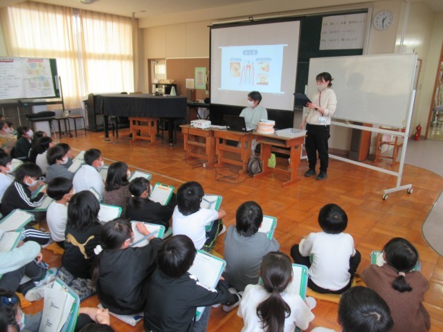 歯の構造の話や虫歯ができる仕組み、おやつを食べる時間、清涼飲料水に入っている砂糖の量など、虫歯につながる原因についての話をうかがいました。子供たちは真剣に話に耳を傾け、自分で必要だと思ったところは一生懸命メモを取っていました。ご家庭で子供たちにどんなことを知ることができたか聞いてみてください。