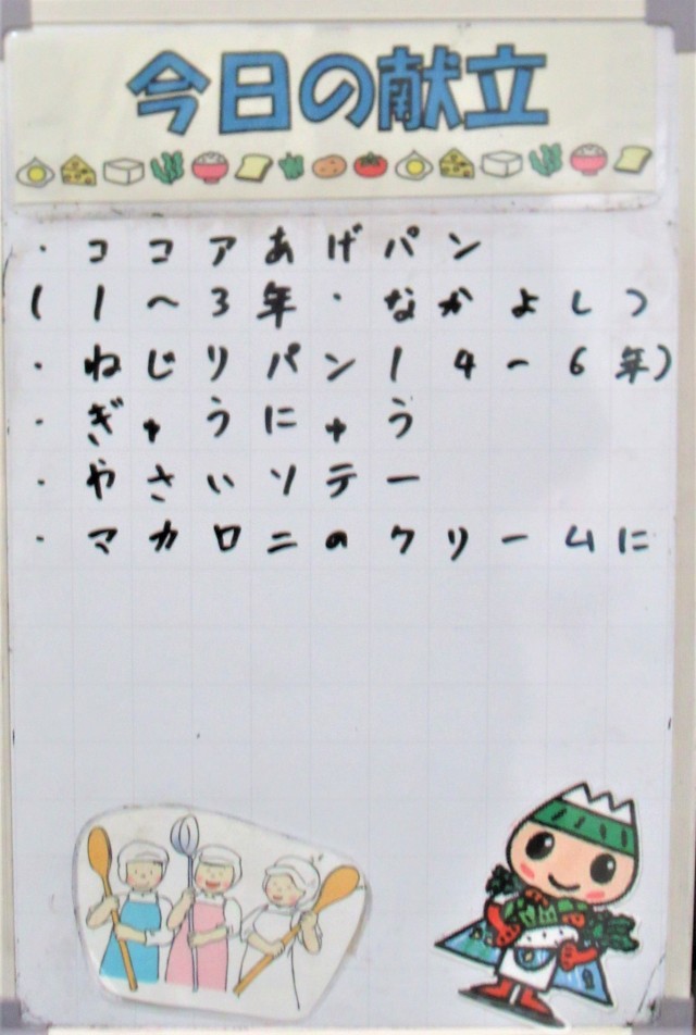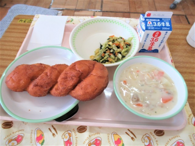 今日は低学年が揚げパンの日でした。そして、いつもの給食の写真の撮影角度を少し変えてみました。子供たちに人気の揚げパン、おいしく食べることができたでしょうか?