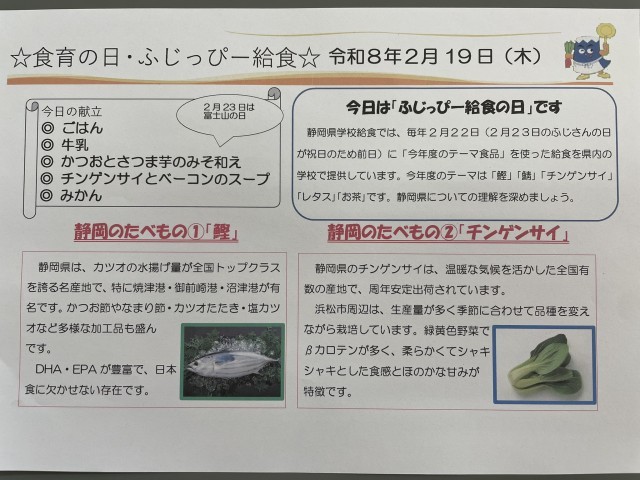 今日の給食は「ふじっぴー給食」でした。毎年富士山の日(2月23日)に提供される、静岡の食の恵みをいかした給食です。