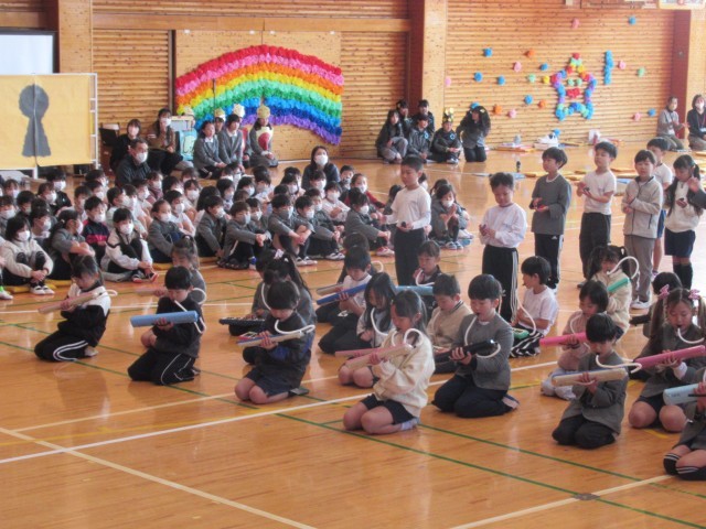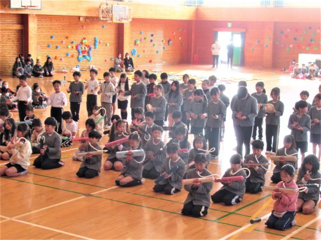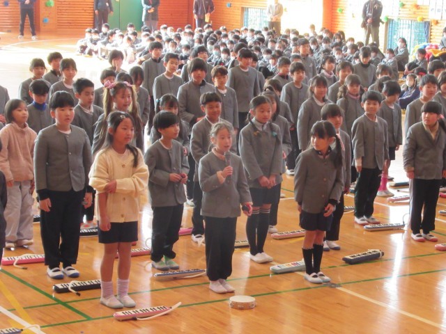 2年生の出し物の様子です。呼びかけとカスタネットや鍵盤ハーモニカによる合奏でした。鍵盤ハーモニカでは、「山のポルカ」を演奏しました。