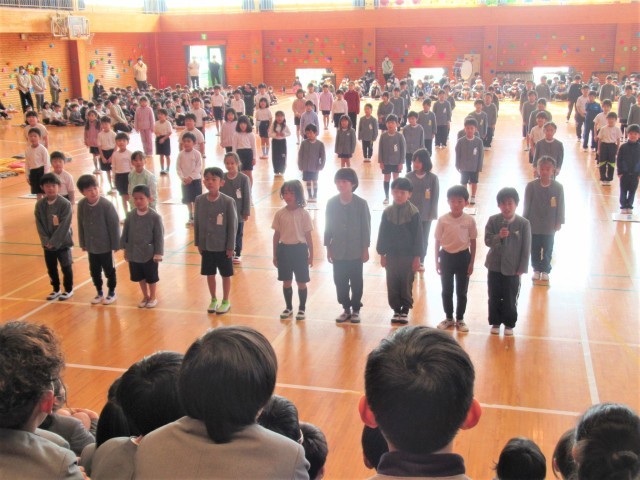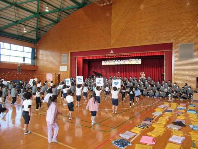 1年生の出し物です。「パプリカ」と運動会でも踊った「アロハ エ コモ マイ」のダンスを全員で踊り、6年生に感謝の言葉の呼びかけをしました。