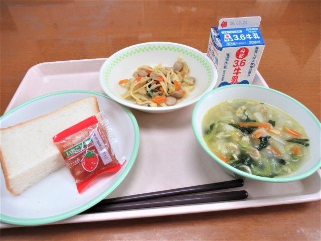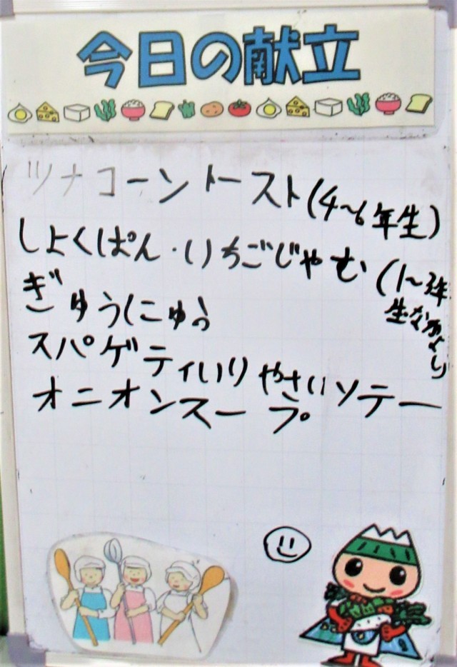 今日の給食は、高学年が「ツナコーントースト」で低学年となかよしが「いちごジャム」でした。ツナコーントーストは、パンの端までツナコーンが塗られていました。南小の給食員さんたちが、1枚ずつ丁寧にツナコーンを塗って作ってくれた「ツナコーントースト」なので、とてもおいしかったです。