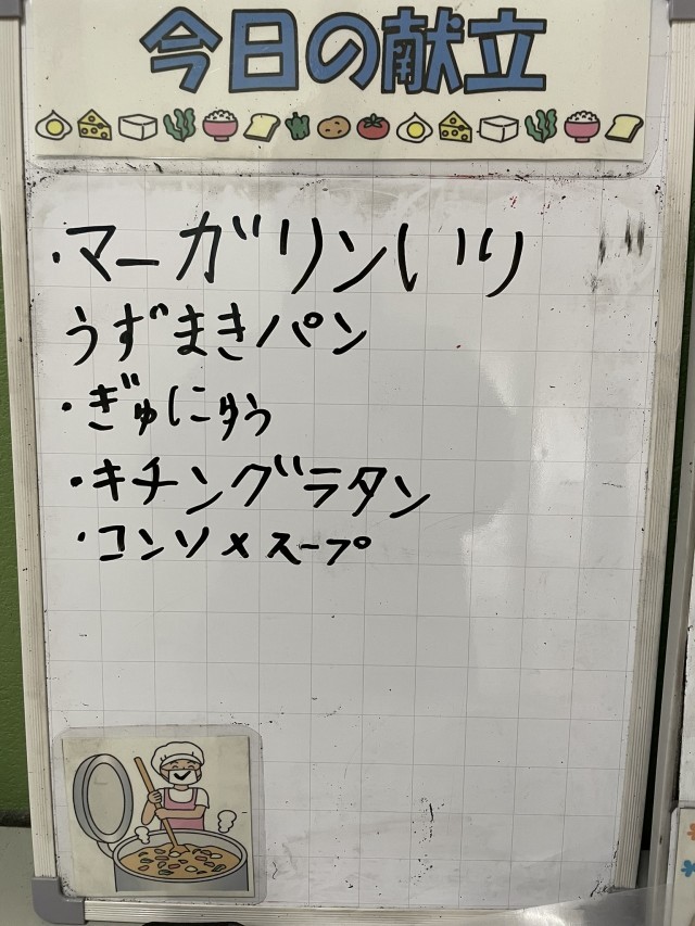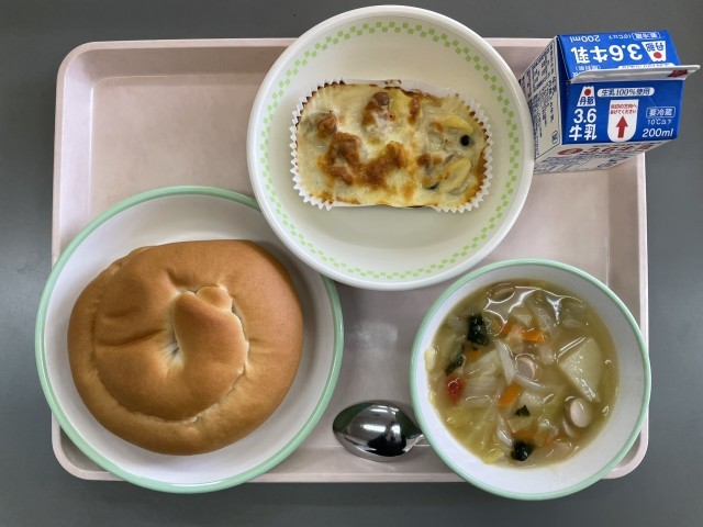今日の給食は、グラタンです。調理員さんたちが全校で17キロ(およそ90個)の玉ねぎを調理して手作りしてくださいました(涙が止まらなそうです)。スープも野菜がたっぷりでおいしかったです。
