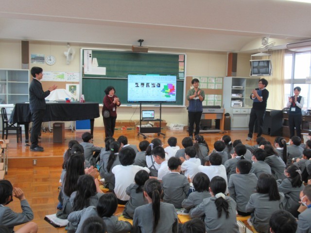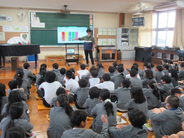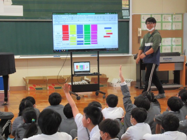 6年生の学年集会の様子です。今年度6年生を担当する先生方の自己紹介をクイズ形式で行いました。好きな教科や好きな食べ物、好きな漫画、将来の夢などから子供たちはどの先生なのかを推理していきました。