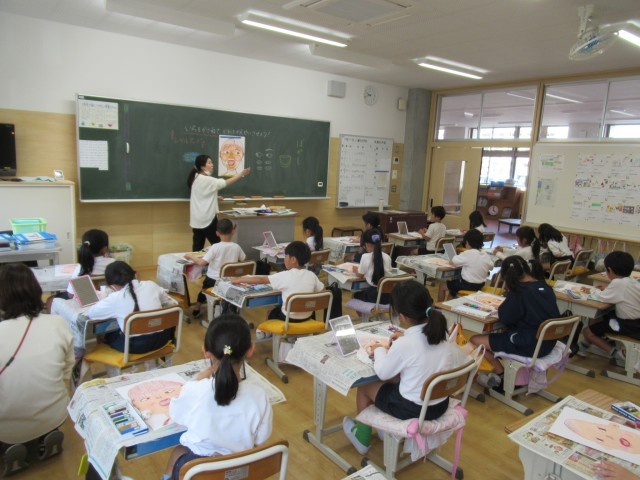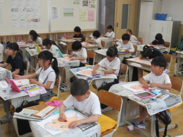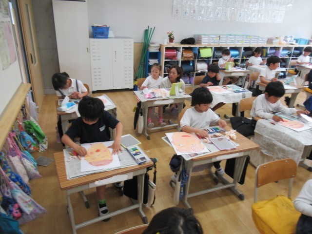 2年生の図工の時間の様子です。クレパスを使って自分の顔を描いていました。顔の色は肌色一色ではなく、ピンクを混ぜで頬のふくらみを表現したり、唇や口の中の色を赤だけでなく、茶色を混ぜたり、黄色を混ぜたりして、本物の色に近づくように自分で工夫しながら、作品を仕上げていました。