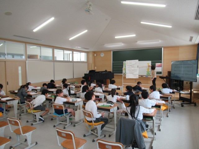 4年生の音楽の様子です。北校舎にできた新しい音楽室を使っての授業の様子です。今日は、リコーダーの練習のための楽譜の準備をしていました。