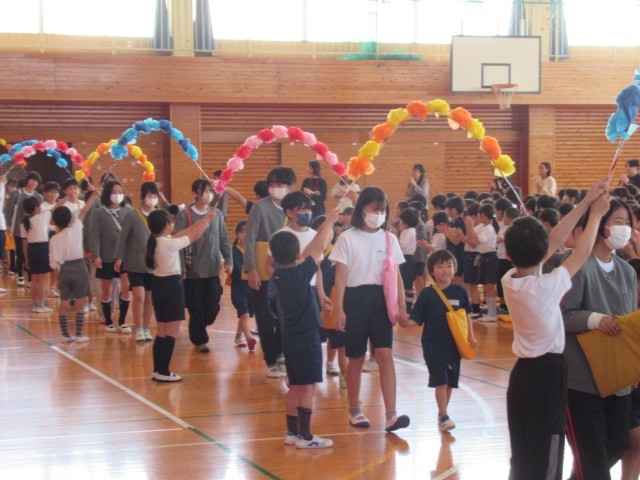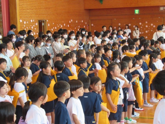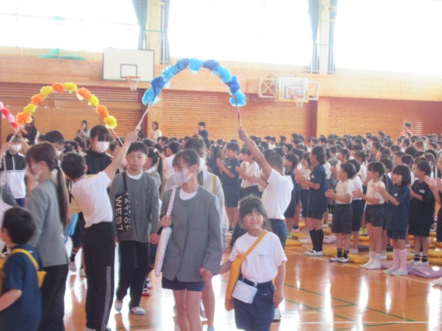 全校で「1年生を迎える会」を行いました。6年生のペアが1年生と手をつないで入場しました。とても微笑ましい姿で、1年生は嬉しそうでした。