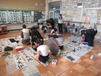 5年生です。(写真上)楽しみにしている子がたくさんいます。サッカーの授業です。(中)「チャレンジ・ザ・米づくり」のまとめです。写真やコメントを入れて、自分だけの一枚を作っていました。(下)「大造じいさんとがん」のまとめです。プリントに自分の考えを書き込んでいました。