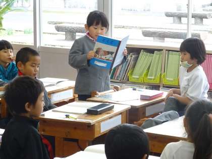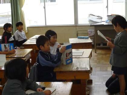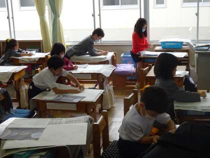 (写真上・中)自分で考えたお話を紹介していました。お話の絵を描き始めました。顔を大きく描いてあって、生き生きしています。