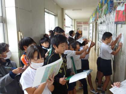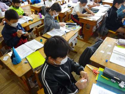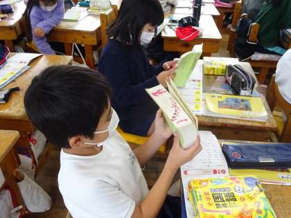 (写真上)図工の作品を見合って、それぞれのよさを感じていました。(中)三角形を切り抜いて、仲間分けをしていました。(下)わからない漢字があると、国語辞典を出して調べていました。