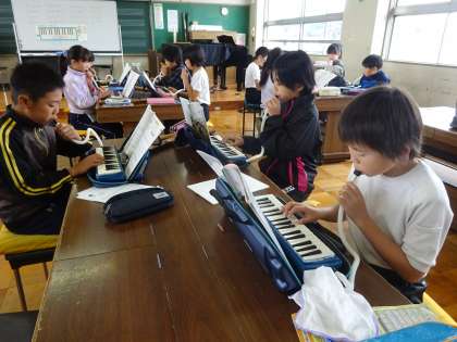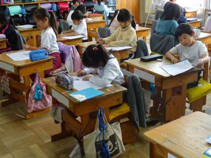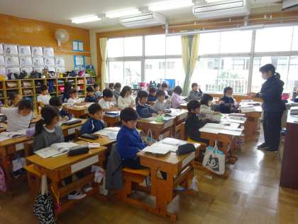 (写真上)これまで学習してきた「かけ算」を生活の中で生かします。今日はその学習でした。(中)国語のテストが始まりました。CDを聞いて、問題に答えていくようです。(下)