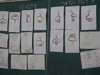 (写真上)どのつなぎ方なら豆電球が点灯するでしょう。分類していました。(中)静岡県の学習をしていました。今日は県内の交通について学んでいます。(下)人数を数えて、表に整理していました。こうすれば、見やすいし、分かりやすいね。算数のよさが感じられます。