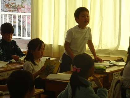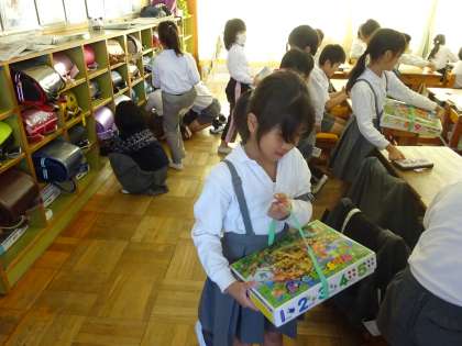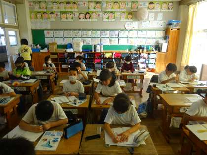 (写真上)算数ボックスを使って、かけ算九九のおさらいをします。(中)国語「かさこじぞう」の登場人物の心情を考えていました。(下)定規やコンパスを上手に使って考える3年生です。