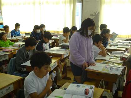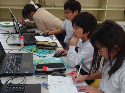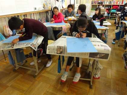 (写真上)「安心、安全で環境にやさしい自動車づくり」について考えていました。(中)防災の視点で、新聞づくりに取り組んでいます。(下)細やかな部分も丁寧に彫り進めていました。