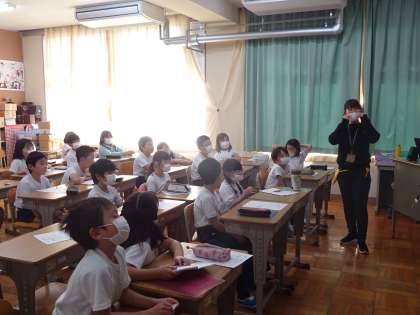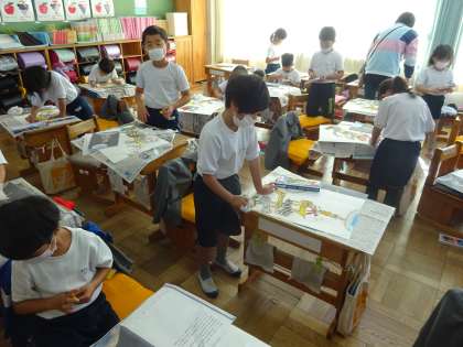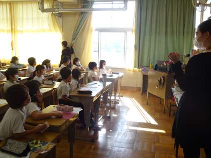 (写真上・中)今日はどんな天気ですか?気分はどうですか?等、日常会話から外国語活動が始まりました。(下)「お月さまってどんなあじ?」を読んで、その場面を絵で表しています。動物の特徴をよく捉えていました。