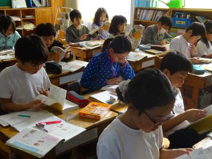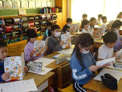 (写真上)この伝記の通り道を「回路」といいます。(中)「モチモチの木」みんなそろって音読をしていました。(下)「大山鳴動してねずみ一匹」ことわざ辞典で調べていました。知識がどんどん増えていきます。