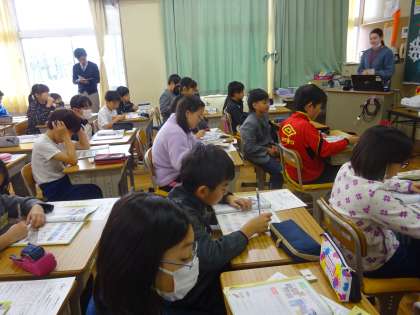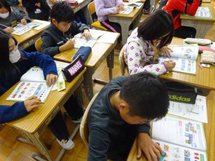 (写真上)楽しみな行事が近づいてきました。みんなで役割を確かめていました。(中・下)英語のヒアリングの場面です。聞くことにも慣れてきました。