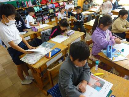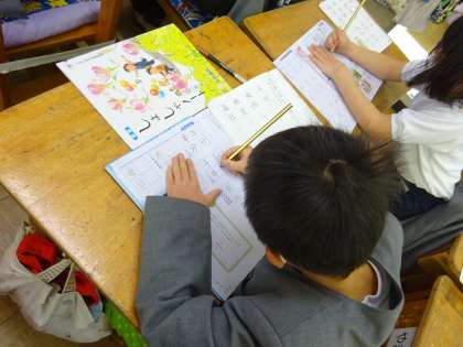 (写真上)生活科の振り返りカードを書いていました。(中)道徳の時間です。自分の考えをまとめる場面でした。(下)書写の時間です。文字の形を整えながら丁寧に書いていました。